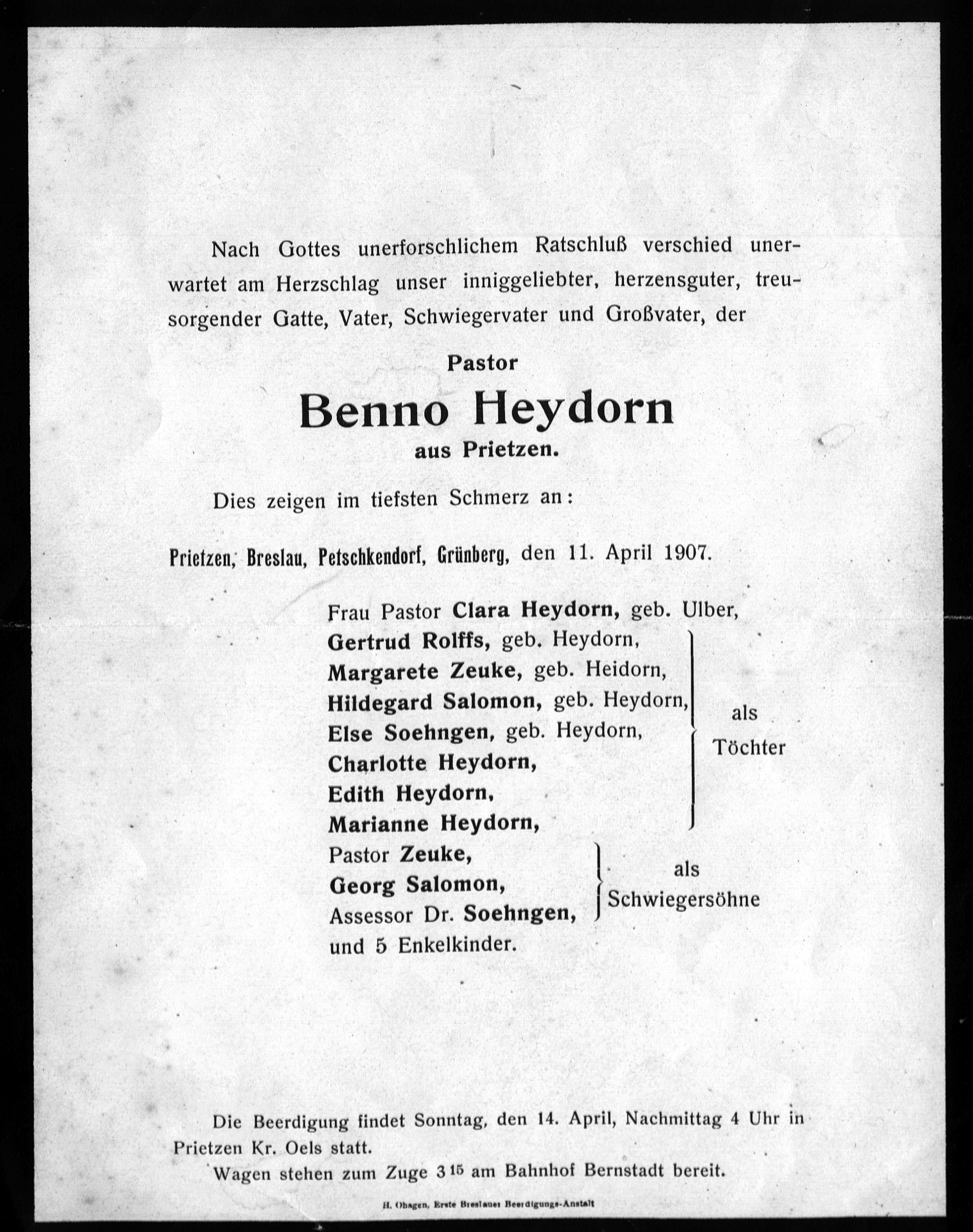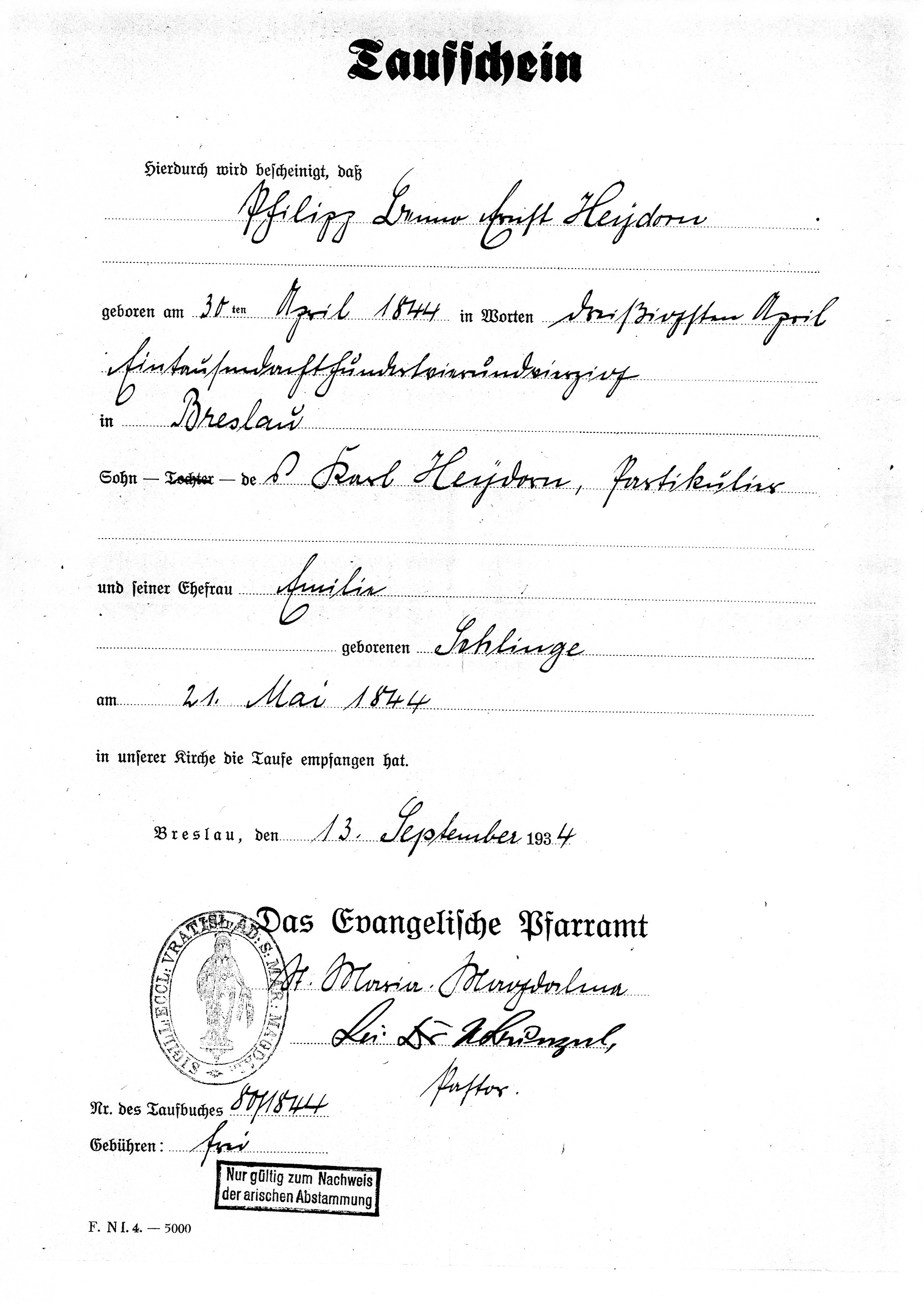 Ernst Benno Philipp Heydorn wurde am 30.04.1844 in Breslau geboren. Er war das erste Kind von Carl Jacob Joachim Heydorn (25.02.1817) und Fredericke Emilie Schlinge (03.05.1817). Sein Vater hatte ein kleines Gut bei Breslau. Der Vater seiner Mutter war Holzhändler.