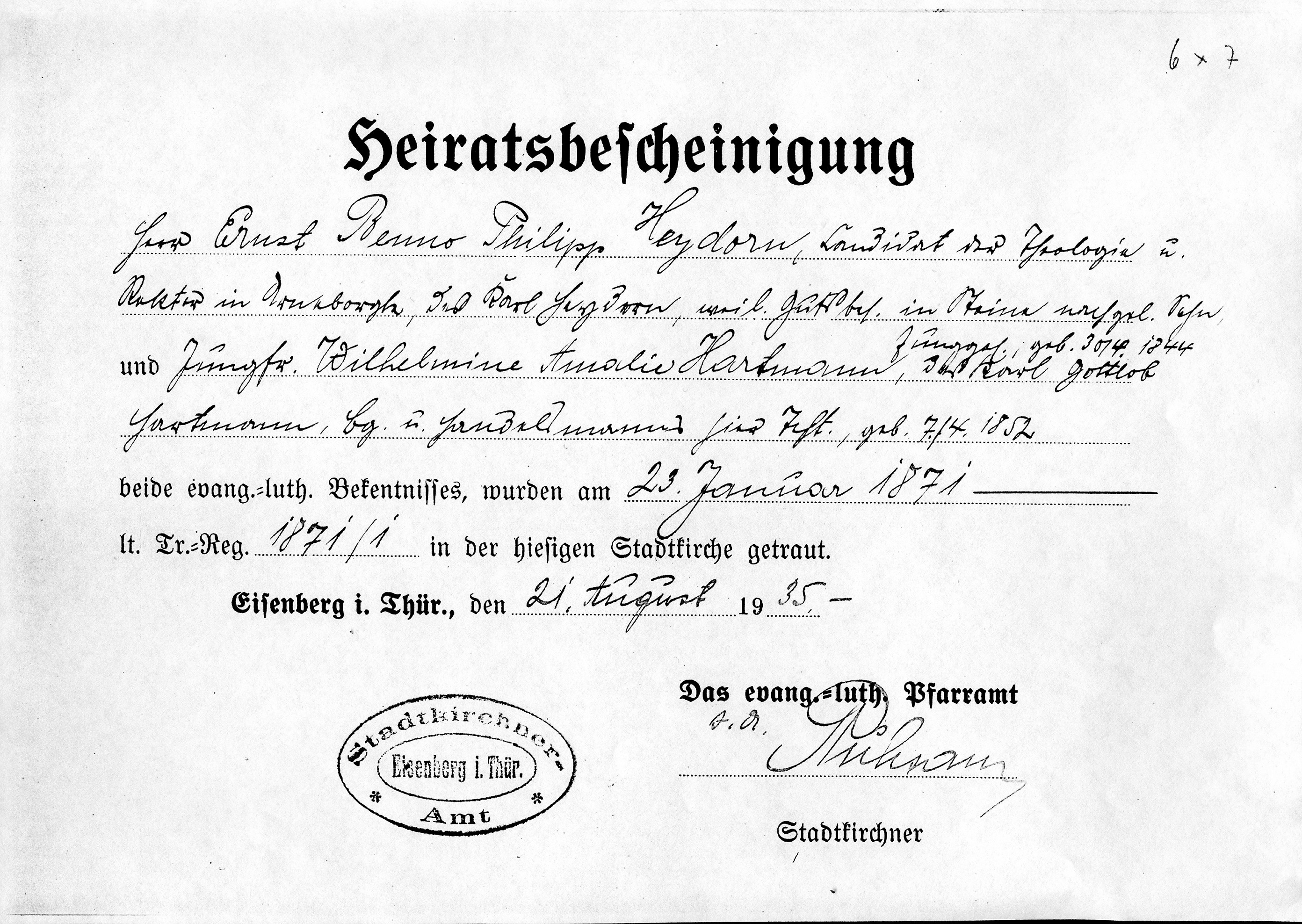 Am 23.01.1871 heiratete er Wilhelmine Amalie Hartmann (07.04.1852) in Eisenberg, Thüringen, Deutschland. Er war 26 Jahre alt, als er Wilhelmine Amalie Hartmann heiratete. Sie war zu diesem Zeitpunkt 18 Jahre alt. Er hatte eine Tochter mit Wilhelmine Amalie Hartmann: Gertrud Johanne Emilie Heydorn (25.12.1871).
